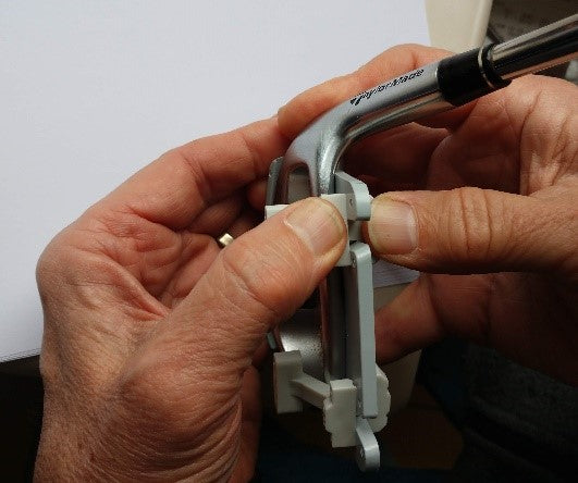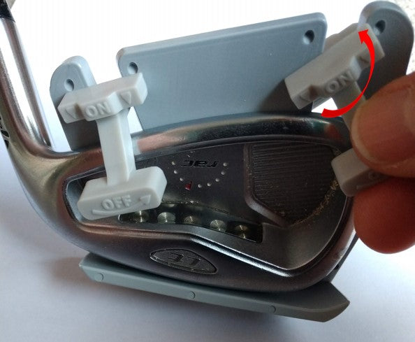 The serrated part of the clamp should engage the teeth on the front side of the cover. Repeat for the second clamp. Then push both clamps a little further so that they are tight on the upper back of the club head.